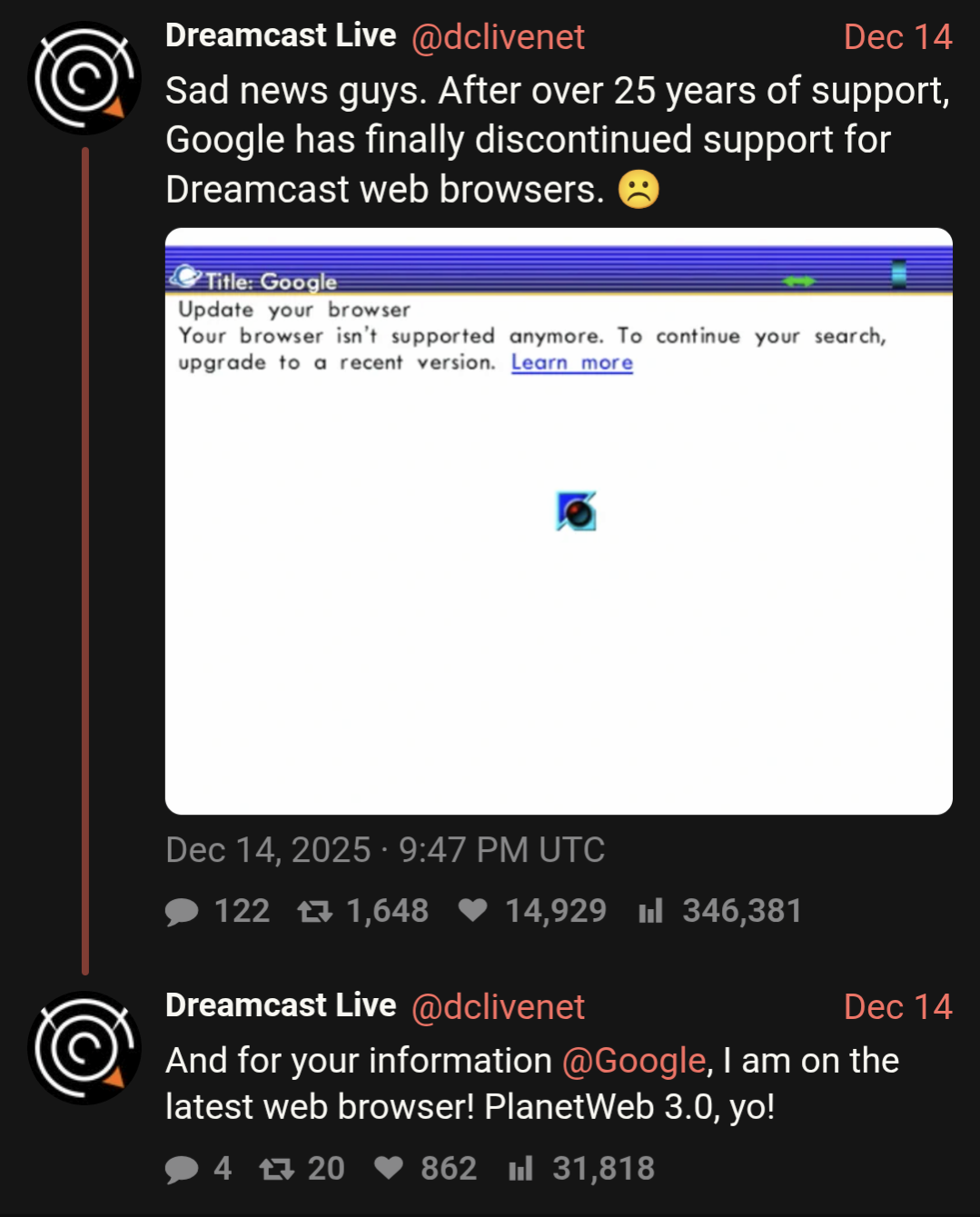 arrow-up1143arrow-down1imageGoogle search page no longer works on Dreamcast's web browserplus-squareretrolemmy.comDie4Ever@retrolemmy.com · 14 hours agomessage-square12linkfedilink