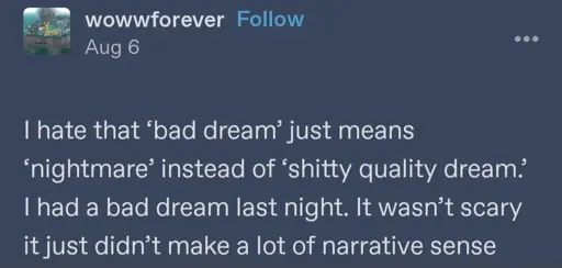 Ah, it’s sort of a blessing and curse sort of thing. I have aphantasia, so I can’t see stuff in my mind. Dreams don’t work the same way, apparently, or at least not for everyone with aphantasia, and I get those, incredibly vividly (tho thankfully not all that often, maybe once or twice a month), but because I have absolutely zero experience with “seeing” things that aren’t real, dreams throw me solidly for a loop and I struggle big time with differentiating them from reality. That makes stress dreams and nightmares really really difficult, and I’ve struggled with them for many years.